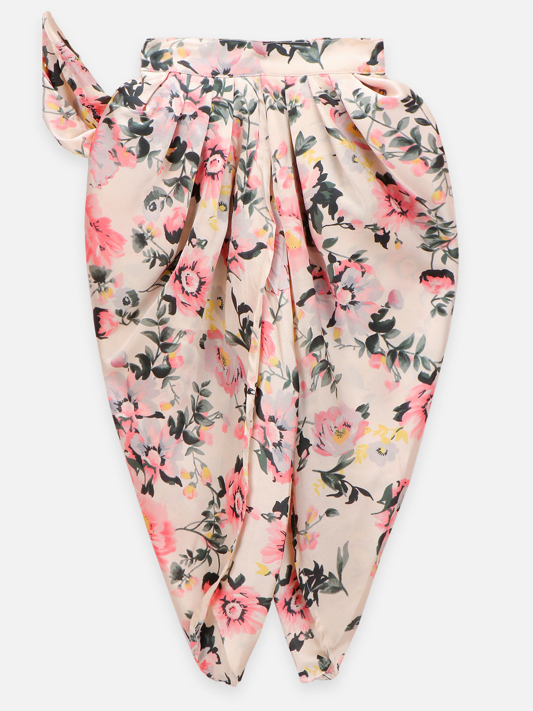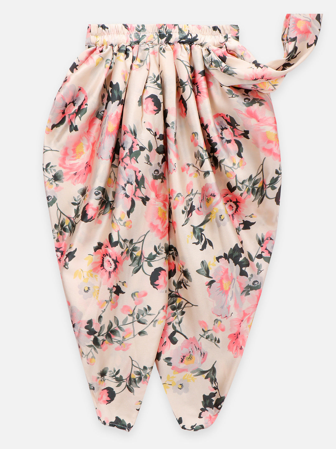 This ethnic Co-Ord set for girls by LilPicks consists of a top and dhoti pants. The satin green solid top has a round neck and short puff sleeves with a handcrafted gota patti flower. Green and white coloured dhoti saree in floral print has a comfy silk blend feel with a drawstring closure. For girls aged 2- 12 years.