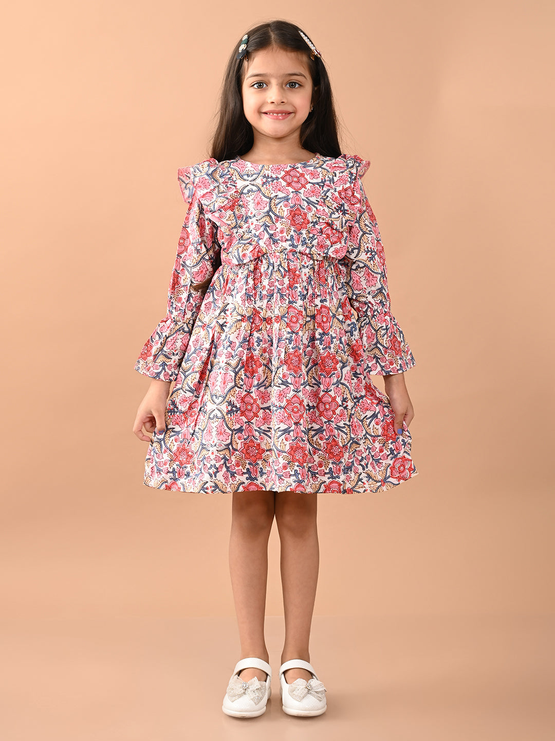 Floral Printed Full Sleeves Ruffle Fit n Flare Dress