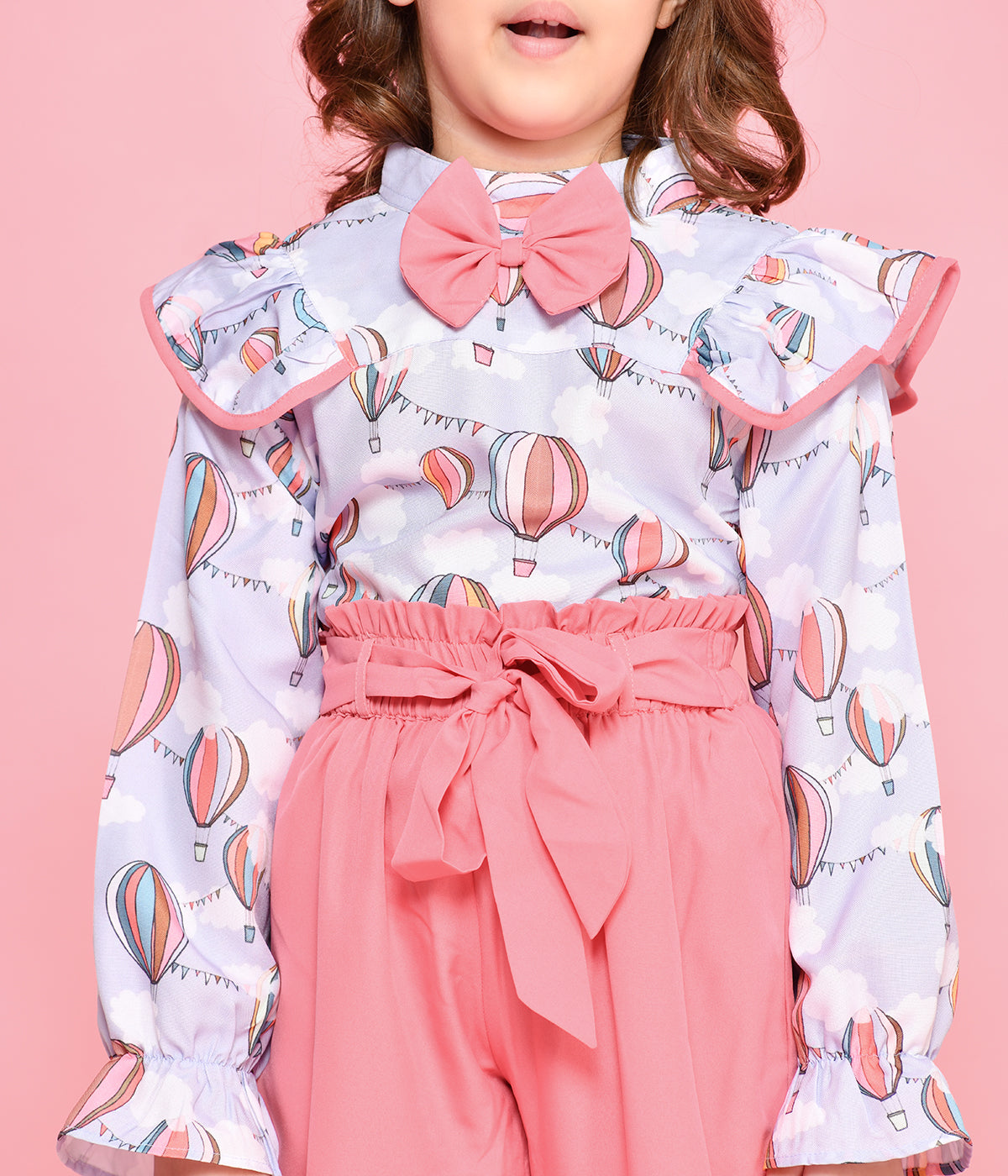 PRODUCT DETAILS: Pretty clothing set for girls with a bow top and pair of jogger trousers by LilPicks. Frilled-pattern multicoloured top has a high neck collar, long sleeves and button closure at the back. Pink high-waist jogger pants feature adjustable drawstrings and front patch pockets. MATERIAL & CARE: Polycotton Machine Wash |