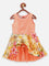 Peach-Coloured floral print fit and flare dress, has a round neck, and flared hem, sleeveless
