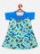 Blue printed woven A-line dress, has a round neck, short sleeves, and flared hem