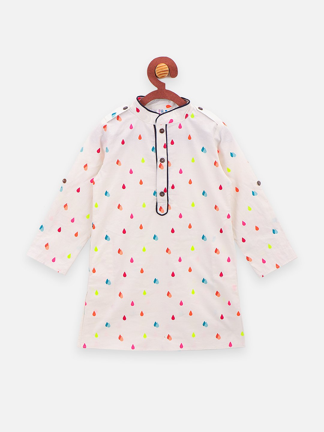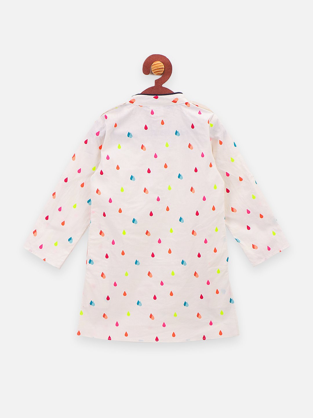 White straight above knee kurta, has a mandarin collar, long sleeves, straight hem
