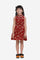 - Maroon printed knitted and woven fit and flare dress, has a mock neck, sleeveless, button closure, and flared hem