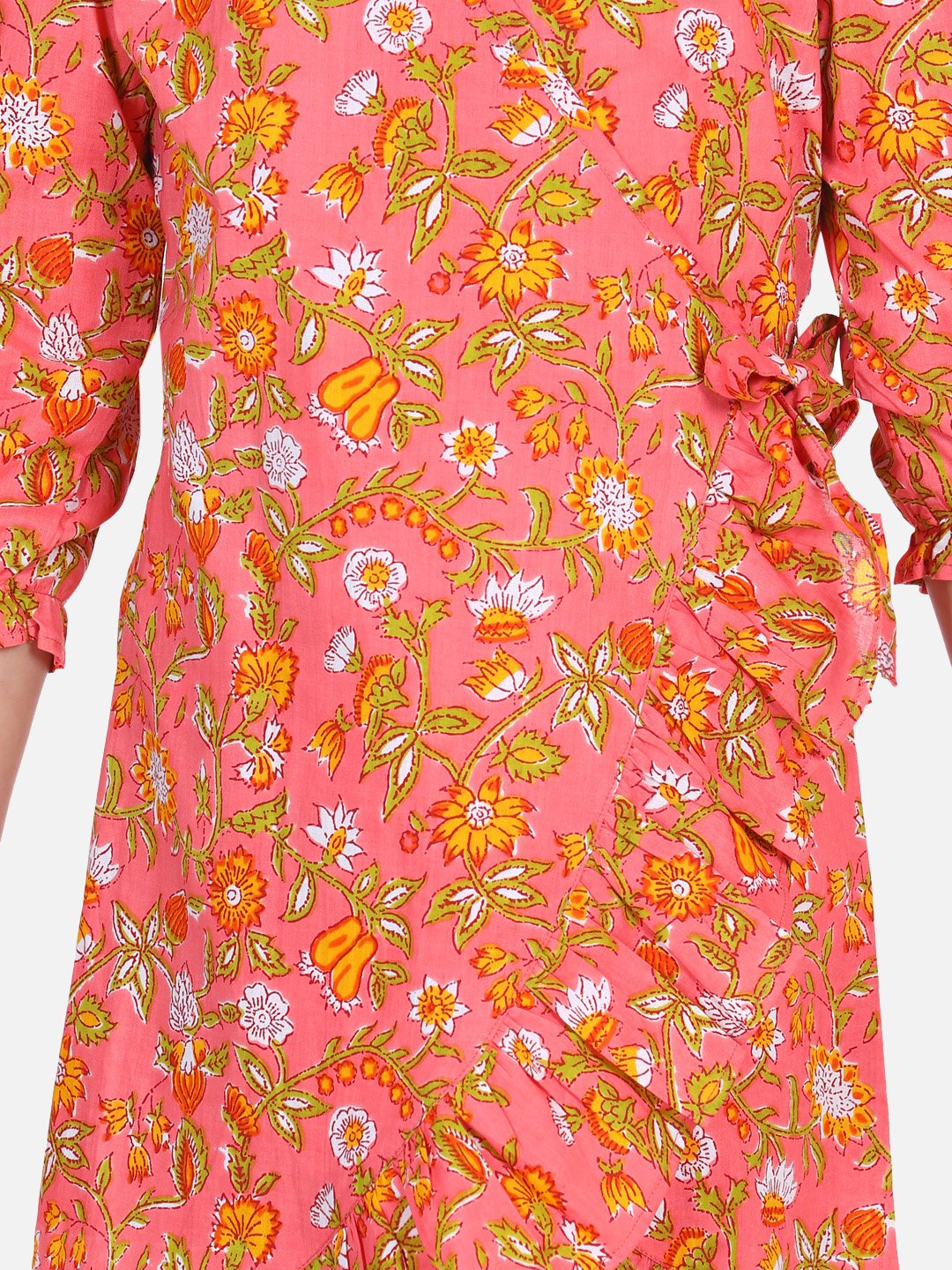 Orange Block Print Frilly Overlap Dress