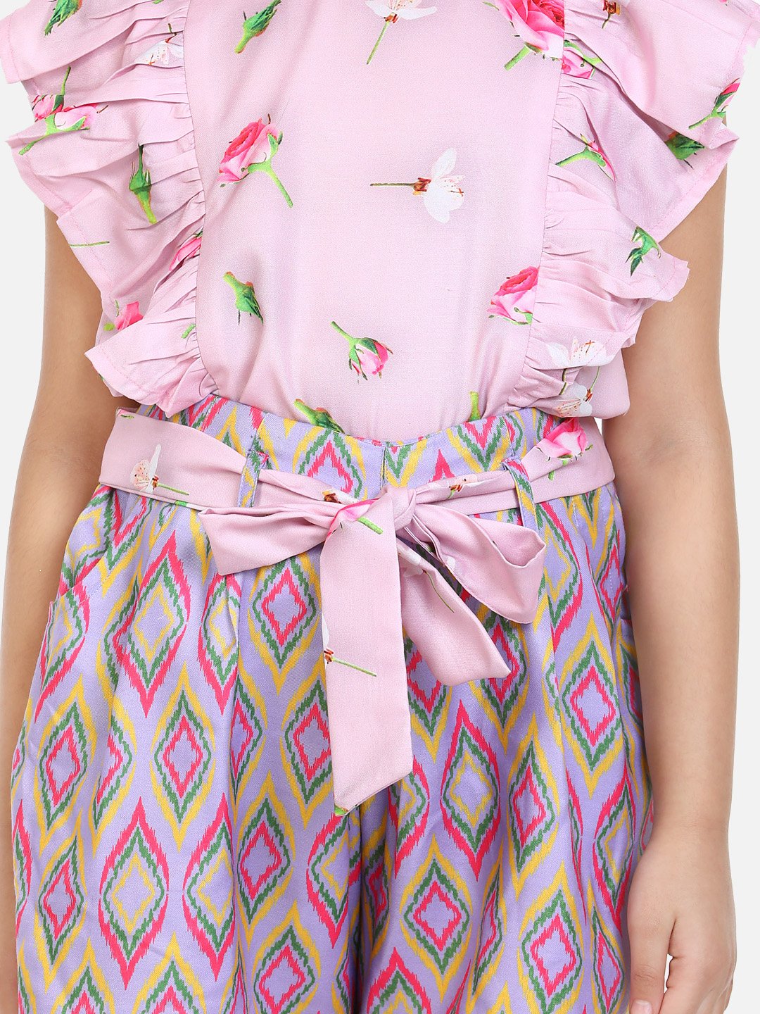 Pink and blue printed top, has a Round-neck, short sleeves, waist tie-up